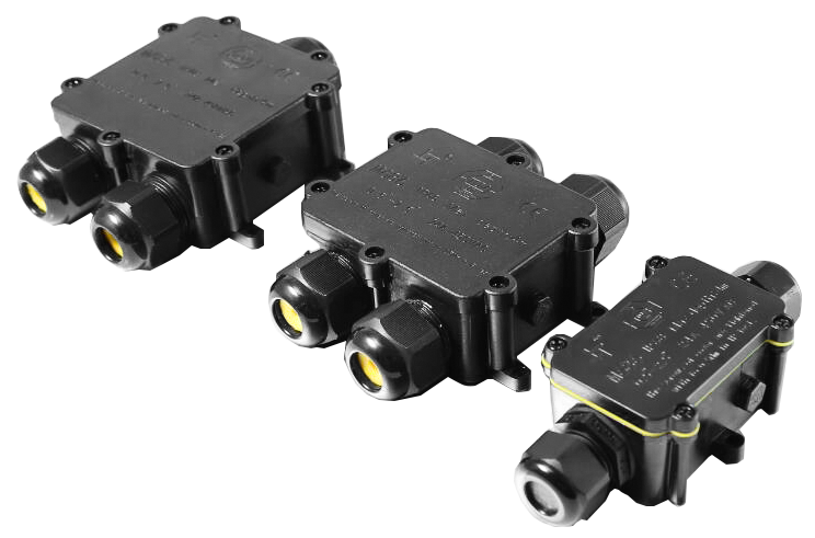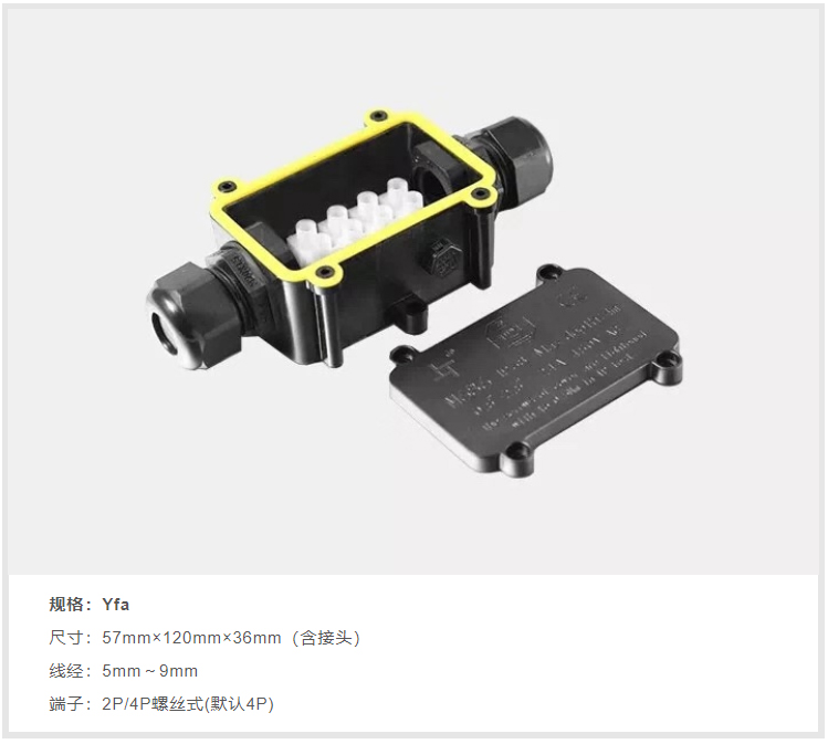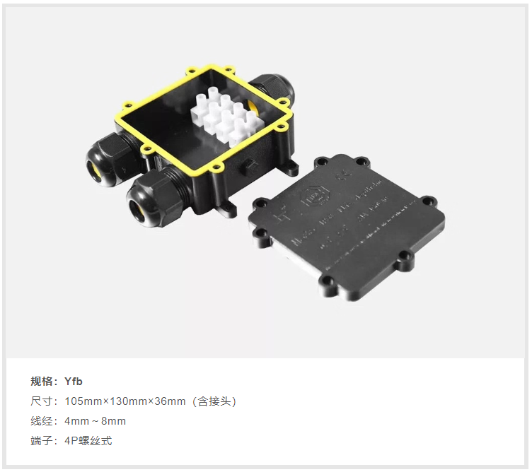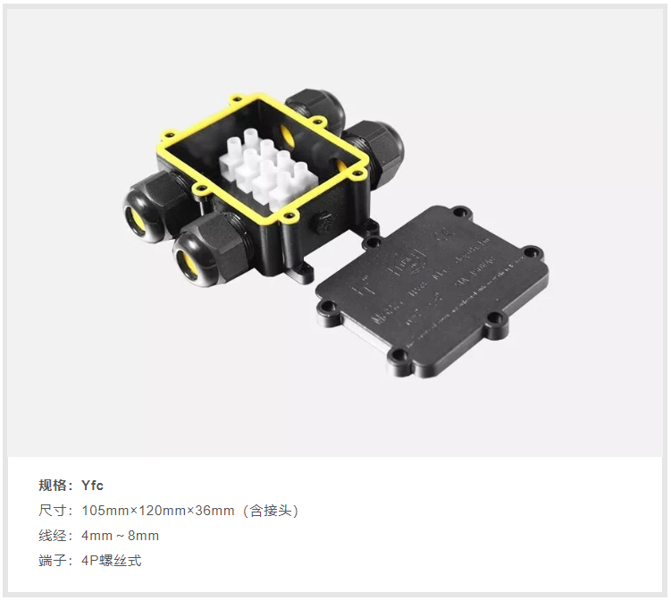 防水接頭與防水接線盒配套使用,實(shí)現(xiàn)線纜接頭防水需求。根據(jù)開孔數(shù)量,可分為一進(jìn)一出,一進(jìn)二出,二進(jìn)二出。