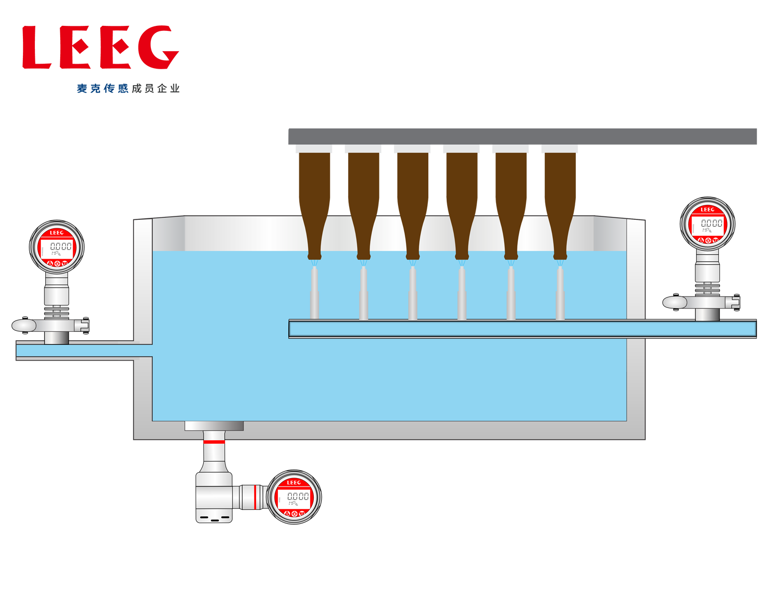 在啤酒瓶、藥瓶、調(diào)味品瓶可以灌入液體之前,需要先進(jìn)行清洗。瓶子進(jìn)入設(shè)備后,首先在堿池中灌滿堿液,去除大部分污漬,然后使用不同溫度的水對瓶子進(jìn)行高壓反沖噴洗,洗去剩余雜質(zhì)和堿液。為了保障設(shè)備穩(wěn)定運(yùn)行,需要采用靜壓方式測量堿池的液位。此外,還需要測量堿池進(jìn)水管和噴頭管道的壓力。